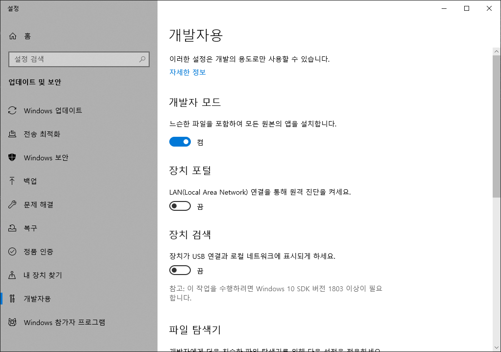 윈도우 개발자용 설정이 보여집니다. 개발자 모드를 on에 놓고 끕니다.