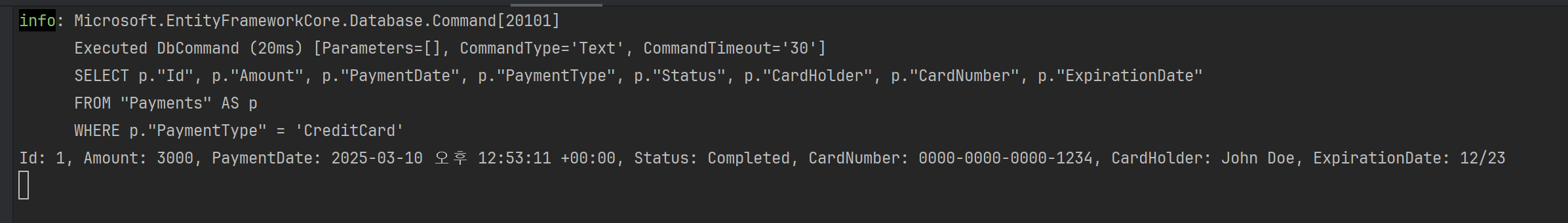 //데이터 추가 context.Payments.AddAsync(new CreditCardPayment { Amount = 3001, PaymentDate = DateTimeOffset.UtcNow, Status = "Completed", CardNumber = "0000-0000-0000-1234", CardHolder = "John Doe", ExpirationDate = "12/23" }); //데이터 가져오기 var list = await context.Payments.OfType<CreditCardPayment>().ToListAsync(); foreach (var creditCardPayment in list) { Console.WriteLine($"Id: {creditCardPayment.Id}, Amount: {creditCardPayment.Amount}, PaymentDate: {creditCardPayment.PaymentDate}, Status: {creditCardPayment.Status}, CardNumber: {creditCardPayment.CardNumber}, CardHolder: {creditCardPayment.CardHolder}, ExpirationDate: {creditCardPayment.ExpirationDate}"); }