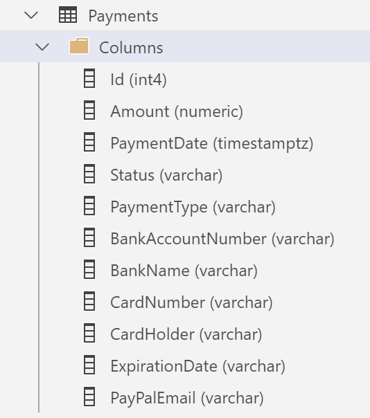 namespace Database.Entity; using System; using System.ComponentModel.DataAnnotations; public abstract class Payment { [Key] public int Id { get; set; } public decimal Amount { get; set; } // 결제 금액 public DateTimeOffset PaymentDate { get; set; } = DateTimeOffset.UtcNow; // UTC 0 기준 저장 [MaxLength(20)] public string Status { get; set; } = "Pending"; // "Pending", "Completed", "Failed" } public class CreditCardPayment : Payment { [MaxLength(20)] public string CardNumber { get; set; } = string.Empty; // 마스킹된 카드번호 (예: ****-****-****-1234) [MaxLength(50)] public string CardHolder { get; set; } = string.Empty; // 카드 소유자 이름 [MaxLength(5)] public string ExpirationDate { get; set; } = string.Empty; // 유효기간 MM/YY } public class PayPalPayment : Payment { [MaxLength(100)] public string PayPalEmail { get; set; } = string.Empty; // 페이팔 계정 이메일 } public class BankTransferPayment : Payment { [MaxLength(30)] public string BankAccountNumber { get; set; } = string.Empty; // 가상 계좌번호 [MaxLength(50)] public string BankName { get; set; } = string.Empty; // 은행명 }using Microsoft.EntityFrameworkCore; using Database.Entity; namespace Database.Context; public partial class ShopDbContext : DbContext { #region TPH public DbSet<Payment> Payments { get; set; } #endregion public ShopDbContext(DbContextOptions<ShopDbContext> options) :base(options) { } protected override void OnConfiguring(DbContextOptionsBuilder optionsBuilder) { } protected override void OnModelCreating(ModelBuilder modelBuilder) { modelBuilder.Entity<Payment>() .UseTphMappingStrategy() .HasDiscriminator<string>("PaymentType") // Discriminator 컬럼 이름 변경 .HasValue<CreditCardPayment>("CreditCard") .HasValue<PayPalPayment>("PayPal") .HasValue<BankTransferPayment>("BankTransfer"); } }DbContext에서 Discriminator 컬럼 설정